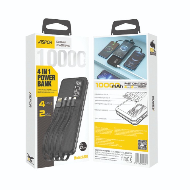 Stay powered up wherever you go with the Aspor A300 10000mAh 4-in-1 Fast Charging Power Bank. Designed for convenience and performance, this portable power bank features built-in charging cables for Type-C, Lightning, and Micro USB devices no need to carry extra cables!