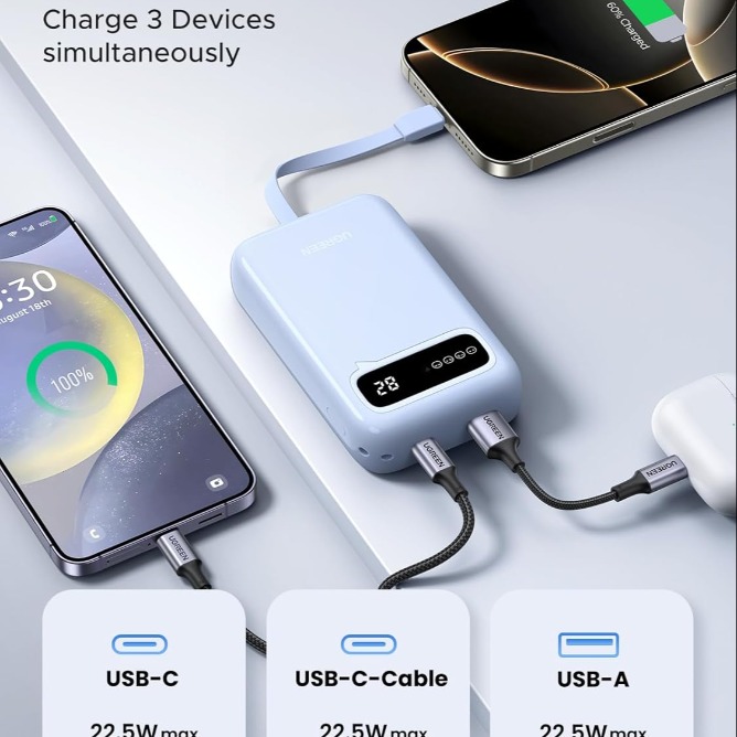 The UGREEN 20W Two-Way Fast Charging Power Bank (Model PB522 / 45423B) is a compact yet powerful 10,000mAh portable charger designed for everyday use, travel, and emergencies. With fast charging and fast recharging via USB-C, plus an additional high-output USB-A port, it ensures your devices stay powered wherever you go.