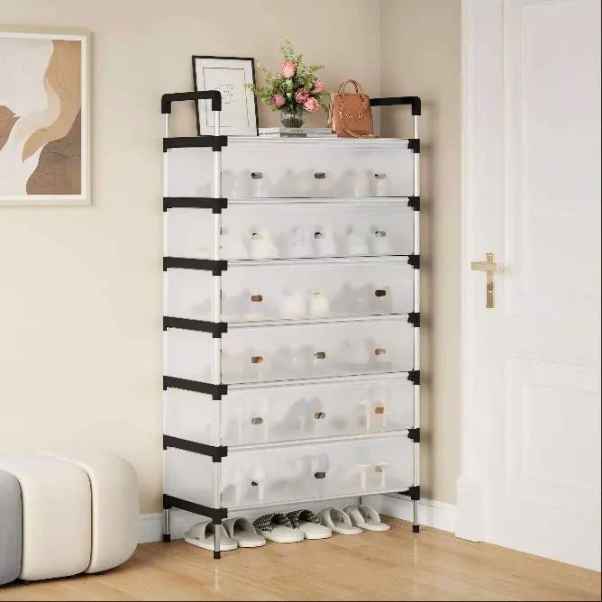 Keep your shoes organized and protected with the 7-Layer Dustproof Shoe Rack with Flip Doors. This sleek and durable shoe storage solution offers seven layers of space, accommodating up to 24 pairs of shoes, boots, and accessories. The innovative flip door design ensures your footwear remains dust-free and fresh, while the high-quality PP membrane and sturdy frame provide durability and long-lasting performance. Ideal for small spaces, this rack is perfect for your closet, entryway, or bedroom. With easy, tool-free assembly, it’s a convenient and stylish solution to your shoe organization needs.