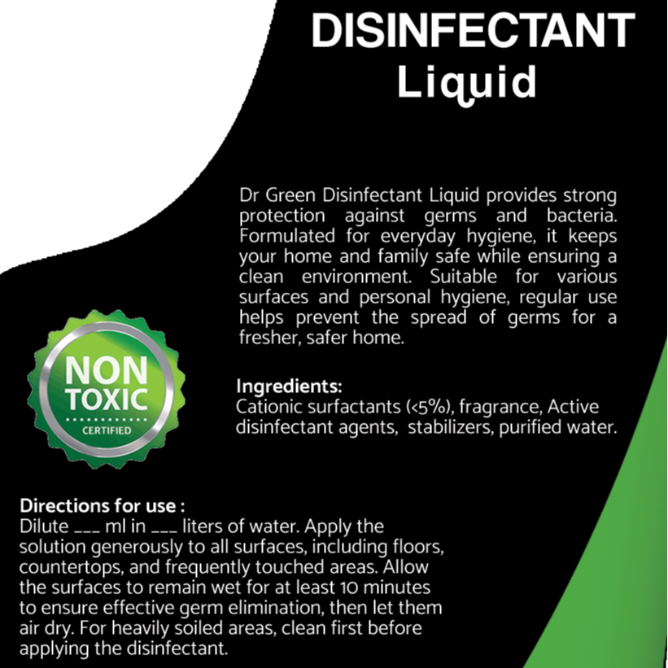 Dr. Green Plant-Based Disinfectant – 500ml is a powerful, eco-friendly disinfecting solution designed for effective sanitation in homes, offices, and industrial environments. Formulated with plant-derived active ingredients, it eliminates germs while being safer for everyday use and environmentally responsible.