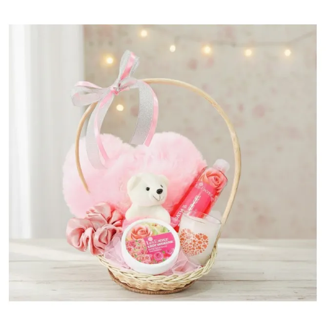 Discover the perfect pampering gift with the Blush Bliss Gift Basket for Her, available at Big Deals. Ideal for birthdays, anniversaries, or simply to show love, this charming gift set is beautifully arranged in a cane basket with a soft pink heart cushion. Bring elegance and relaxation to any special lady in Sri Lanka with this delightful package.