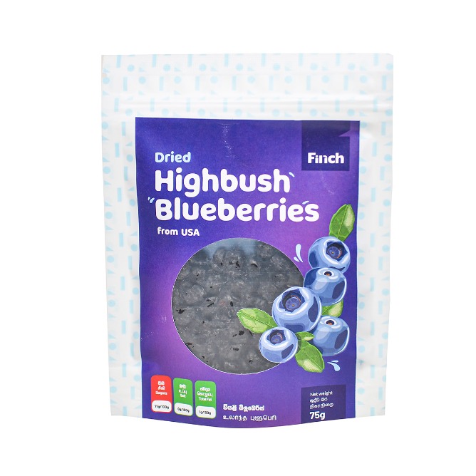 Finch Dried Highbush Blueberries – 75 g are sweet and chewy dried blueberries made from highbush varieties harvested at peak ripeness. Gently dehydrated to preserve flavour, nutrients and antioxidants, they make a healthy, convenient snack and a versatile ingredient to boost everyday meals. Enjoy them straight from the pack or add them to cereals, baked goods, trail mixes and more for a burst of natural fruity taste and nutrients.