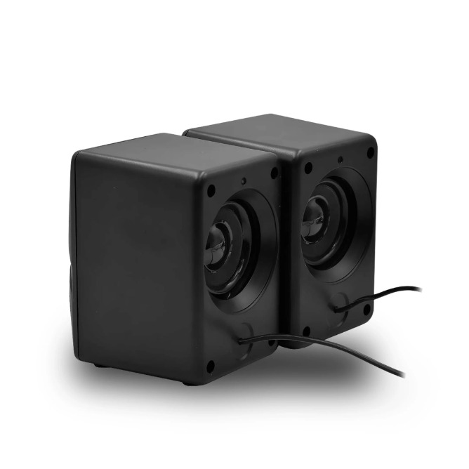 Compact speakers (~65 × 80 × 100 mm each) fit easily on desks or gaming setups.