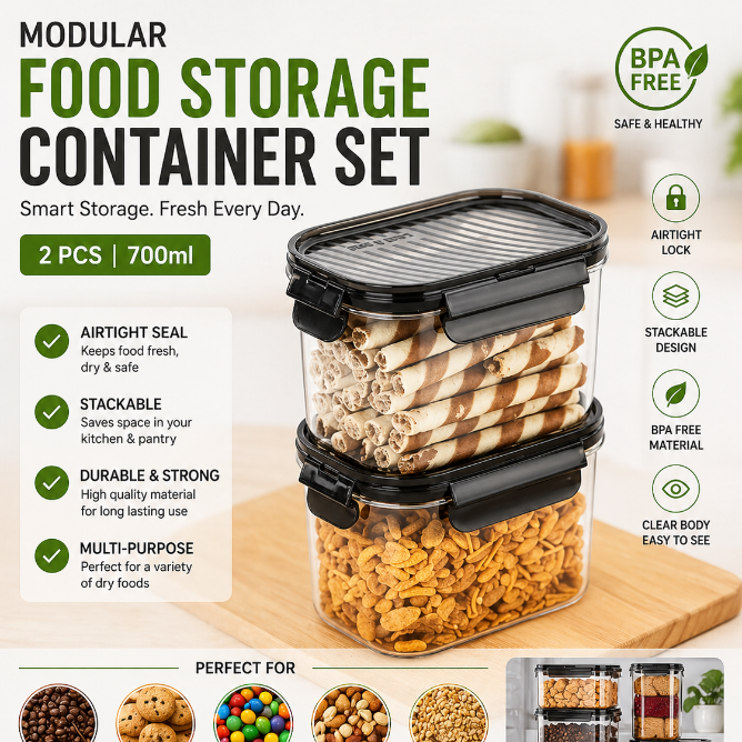 Keep your kitchen neat and organized with this Modular Airtight Food Storage Container Set. Designed with a secure locking lid, it ensures your food stays fresh, dry, and protected from moisture.