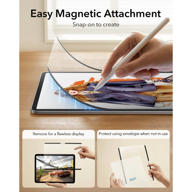 Give your iPad a natural, pen-on-paper feel with the ESR Paper Feel Magnetic Screen Protector. Its magnetic edges attach instantly when you’re ready to draw or take notes, and detach just as easily for a perfectly clear view of your original display. The included protective envelope keeps your screen protector safe wherever you go.