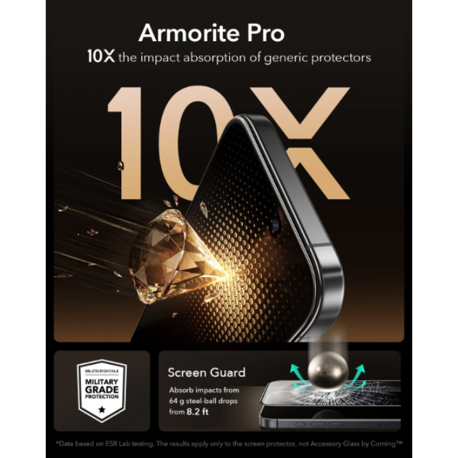 The ESR UltraFit Armorite® Pro Screen Protector delivers elite defense paired with effortless installation. Built with Corning® Glass engineered to endure up to 110 lbs of pressure, it provides shatterproof, drop-resistant, and scratch-resistant protection while keeping your screen crystal clear. The anti-reflective coating enhances visibility, giving your display a cleaner, more vibrant look.