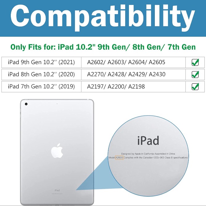 exclusively for iPad 10.2 inch 2021 9th Generation (model number A2602 A2603 A2604 A2605), 2020 8th Generation (model number A2270 A2428 A2429 A2430) AND 2019 7th Generation (model number A2197 A2198 A2200), please checked the model number at the back of the iPad (NOT compatible with any other iPad models)