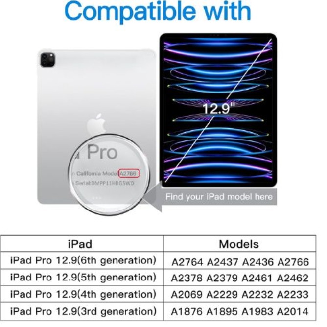 Compatible with Face ID and Apple Pencil. Designed for iPad Pro 12.9-inch 2022/2021/2020/2018 Release Edge to Edge Liquid Retina Display. Fit iPad Models: A2436 A2233 A1983 A2764 A2437 A2766 A2378 A2379 A2461 A2462 A2229 A2069 A2232 A1876 A2014 A1895. Please check back bottom of your iPad to find the model number