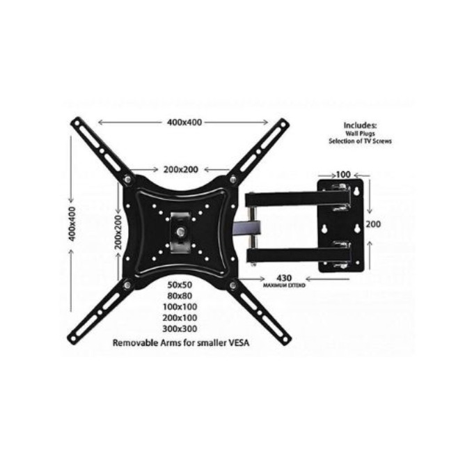High quality 180 degree Rotatable Tv Wall Mount. Perfect for 14"- 45" LED / TV / Monitor / Plasma / 4K Tv's . Move your Tv left and right upto 180 degrees and up and down having a tilted angle of 30 degrees. The safety loading weight is 25 kgs. These TV Wall Mount Bracket's are ideal for Television installations at Homes, Office's, Cafe's, Mall's, Restaurant's, Hotel's, Factories, School's, Conference Room's, Clinic's, Hospital's and more . Solid dual arm heavy gauge steel construction with lift and hook design for faster installation. Product coated with rust free powder, black finishing