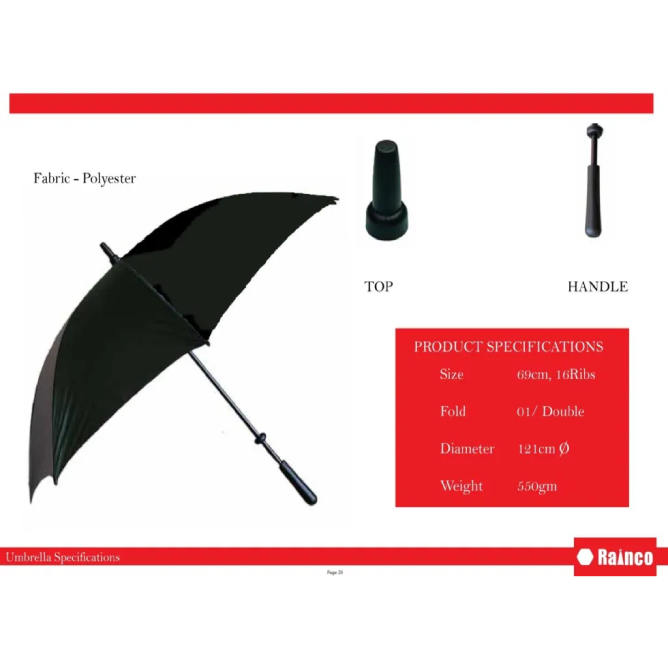 Crafted with high-quality polyester fabric, it provides excellent water resistance, while the 69cm, 16-rib structure offers superior wind protection. With a 121cm open diameter, it delivers ample coverage, keeping you well-protected in any weather. Weighing 510g, it remains sturdy yet easy to carry. A timeless essential, the Rainco 27″ Gents Umbrella is designed for everyday reliability.