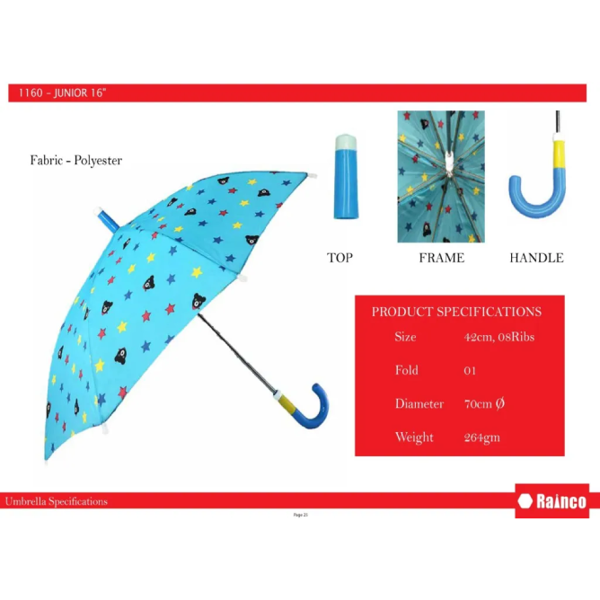 Rainco Junior 15″ Kids Umbrella (Item Code: 1060)Brighten up your child’s rainy day with the Rainco Junior 15″ Kids Umbrella. Specifically designed for young children, this 1-fold umbrella features a 42cm, 08-rib structure, providing sturdy and reliable coverage.